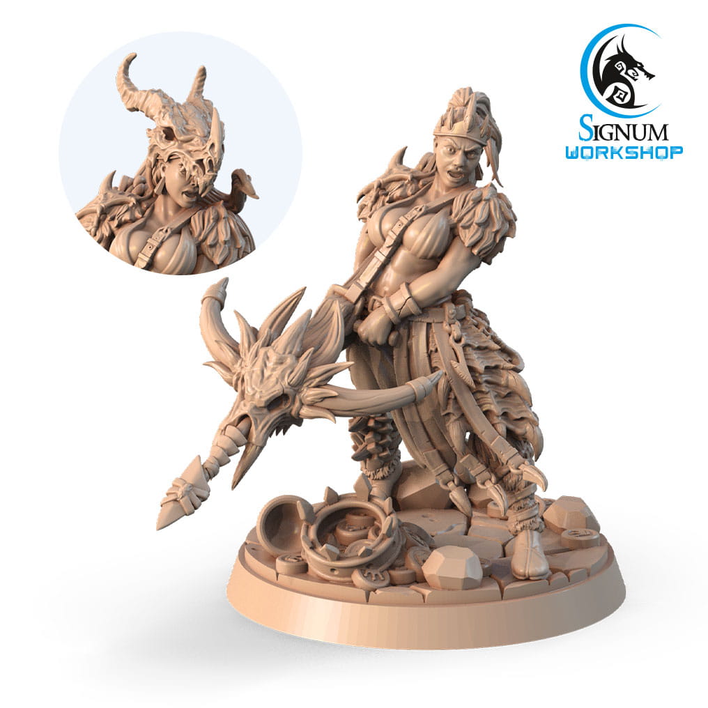 Elia the Amazons Queen od Signum Workshop. Wysokość dla skali 32mm: ok. 3,5cm (bez podstawki). W zestawie znajdują się oba warianty głów
